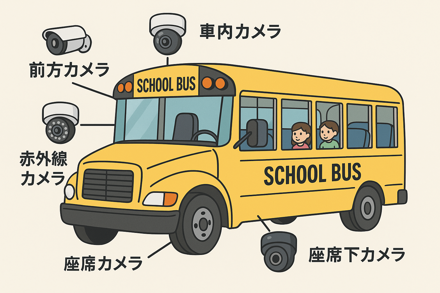 これで 安全確認・防犯・防災・トラブル対応 をカバーしつつ、幼稚園児や小学生の乗車バスでも安心できる構成になります。 🔴 中央天井カメラ(通路全体)🔴 後部天井カメラ(最後列の死角防止)🔴 座席下カメラ(取り残しゼロ対策)