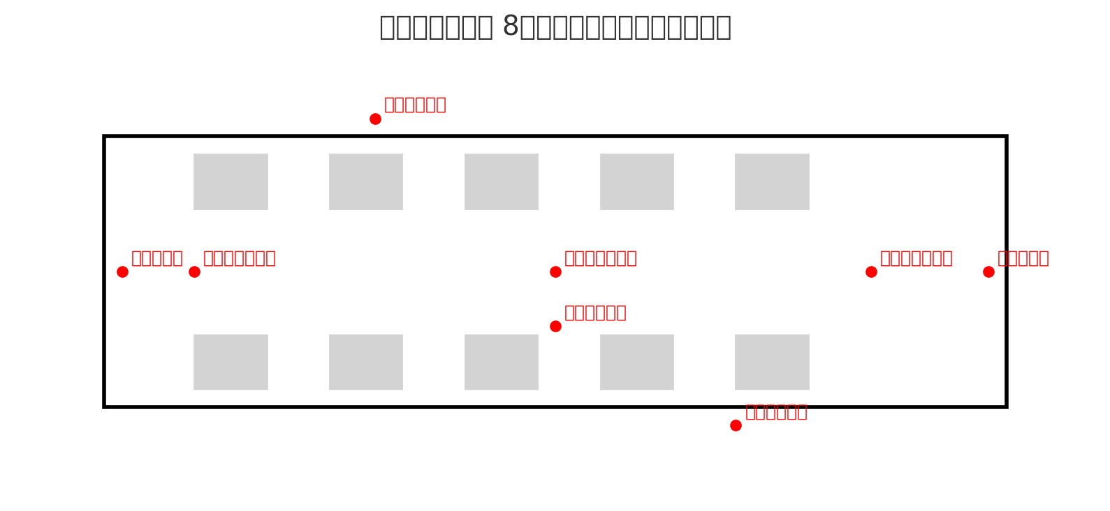 こちらがスクールバスを想定した 8チャンネル監視カメラ配置図 です。 こちらが 6カメラ構成のスクールバス監視配置案 です(外側の左右カメラを省いたパターン)。